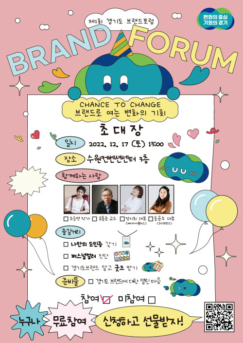 도민과 시·군, 전문가가 참여해 브랜드로 함께 소통하는 이번 포럼에선 다채로운 부대행사도 운영한다. 31개 경기도 시·군 브랜드를 만나볼 수 있는 ▲브랜드 전시관, 나만의 브랜드를 찾아보는 ▲퍼스널컬러 진단 ▲경기도민증 만들기와 도정 브랜드 ▲‘봉공이’ 캐릭터 컬러링 등이 진행된다.