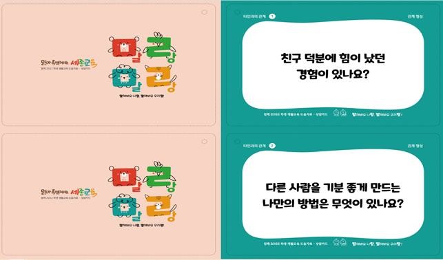 자신과의 관계, 타인과의 관계, 공동체와의 관계를 주제로 한 질문카드 36매와 진행을 위한 도움카드 3매, 교사가 필요한 질문을 추가하여 사용할 수 있는 빈 카드 6매의 총 45매로 구성됐다.