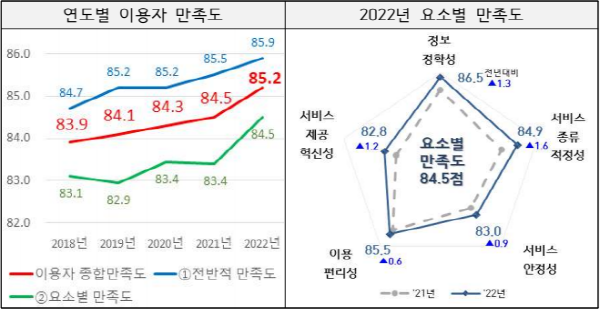 조사 결과 ‘전반적 만족도’는 85.9점으로 전년 대비 0.4점 높게 나타났고, ‘요소별 만족도’는 84.5점으로 전년 대비 1.1점 높게 나타났다.