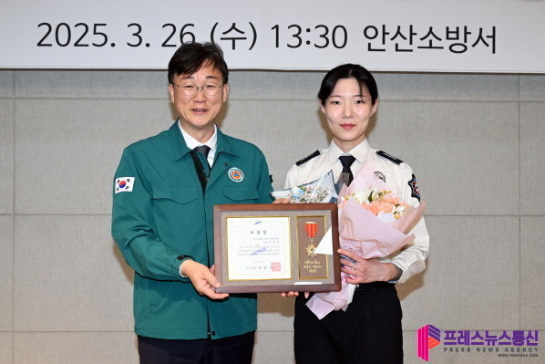 | ▲이민근 안산시장(왼쪽)이 지난 26일 안산소방서에서 유민정 안산소방서 소방관에게 모범 시민상을 수여하고 함께 사진을 촬영하고 있다.(사진=안산시) |