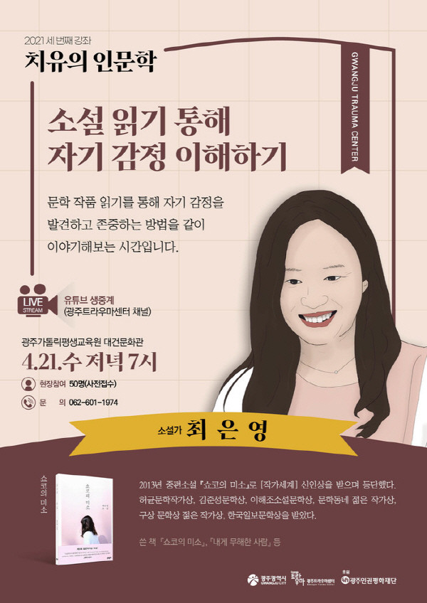 치유의 인문학은 코로나19 사회적거리두기에 따라 인원을 제한하며, 유튜브 채널 ‘광주트라우마센터’로도 생중계될 예정이다. 강연 내용은 광주트라우마센터 홈페이지의 ‘활동과 소식’에서 확인할 수 있다.