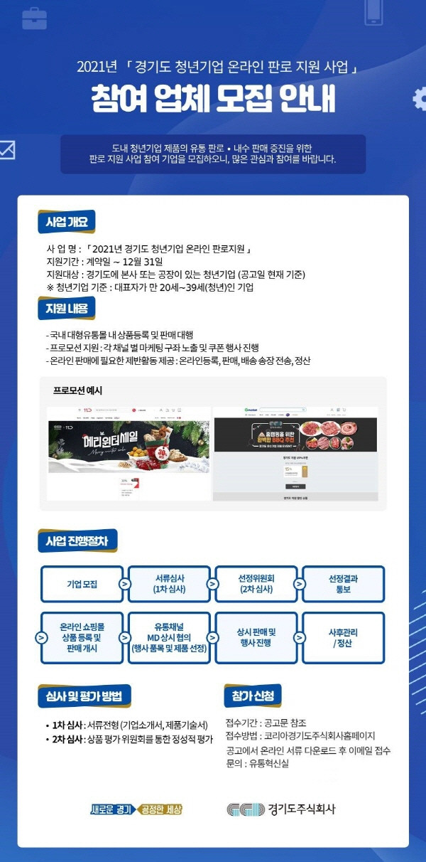 경기도주식회사는 도내 우수기업 제품 판로 확대를 위해 이 같은 내용의 ‘2021년 경기도 청년기업 온라인 판로지원 사업’을 추진, 참여 업체를 모집한다고 17일 밝혔다.