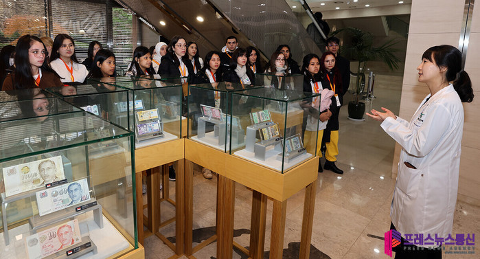 | ▲ 지난 29일 초청된 해외 청소년들이 하나은행 위변조대응센터에서 전 세계 다양한 화폐에 대한 설명을 듣고 있다.(사진=하나은행) |