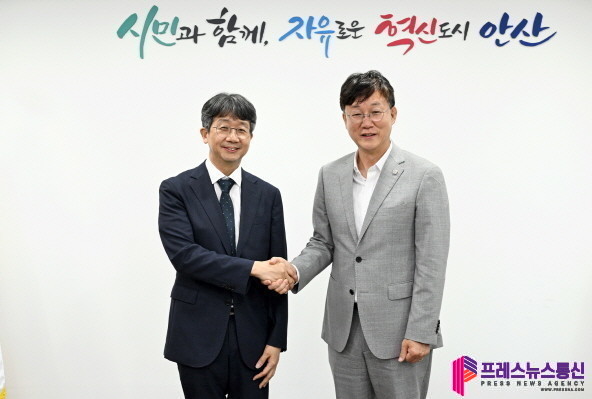 ▲이민근 안산시장(오른쪽)이 지난 1일 임승관 질병관리청장(왼쪽)과 시민 건강 보호를 다짐하며 손을 맞잡고 있다.(사진=안산시) |