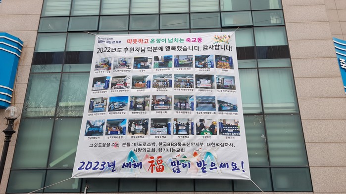 홍성채 죽교동장은 “지난해 코로나19 등 여러 가지 힘든 일이 많았음에도 형편이 어려운 이웃을 생각하고 사랑과 관심을 전한 후원자들에게 감사한 마음을 표현하고자 현수막을 게시하게 됐다”며 “나눔 문화 분위기를 확산시키고 다양한 주체들의 참여를 이끌어 인적·물적 자원 발굴에 힘쓰겠다”고 밝혔다.