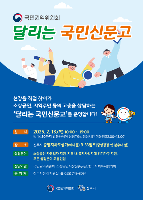 | ▲진주시는 오는 13일 오전 10시부터 오후 3시까지 중앙지하도상가(중앙광장 B-33점포)에서 국민권익위와 함께 공동 주관하는 ‘달리는 국민신문고’를 운영한다.(사진=진주시) |