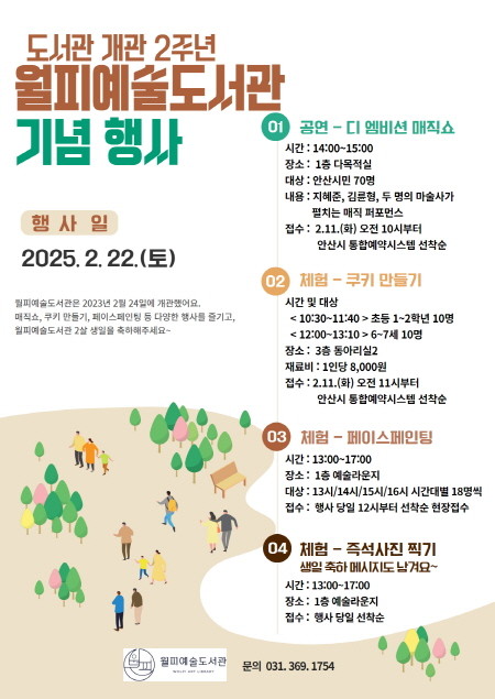 [프레스뉴스] 장현준 기자= 안산시(시장 이민근) 월피예술도서관은 오는 22일 개관 2주년 기념을 맞아 다양한 문화행사를 준비해 개최한다고 6일 밝혔다.