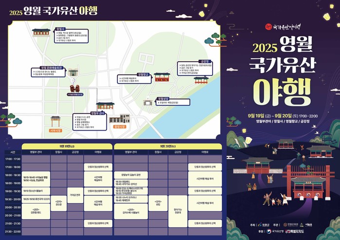 17일 군에 따르면 이번 행사는 국가유산청과 강원특별자치도의 후원을 받아 영월문화원과 함께 추진되며, 오후 5시부터 10시까지 문화유산을 배경으로 한 야경, 공연, 강연, 체험, 먹거리 등 8개 테마의 다채로운 야간 프로그램이 진행될 예정이다.