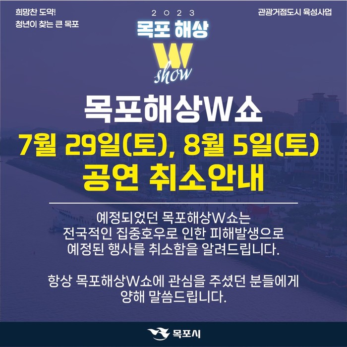 [전남=프레스뉴스] 이광남 기자= 전남 목포시는 목포해상W쇼 개최 예정이었던 7월 29일 정기공연과 8월 5일 특별공연을 취소한다고 밝혔다.