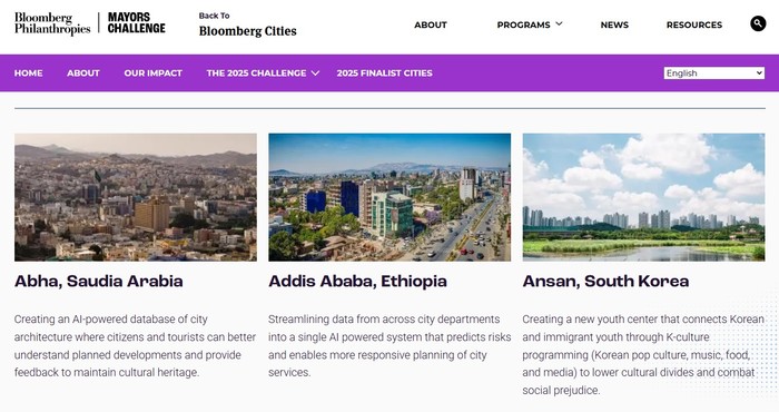 ▲미국 블룸버그재단 공식 웹사이트에 안산시가 2025 글로벌 시장 챌린지 최종후보도시로 올라있다.(사진=안산시) |