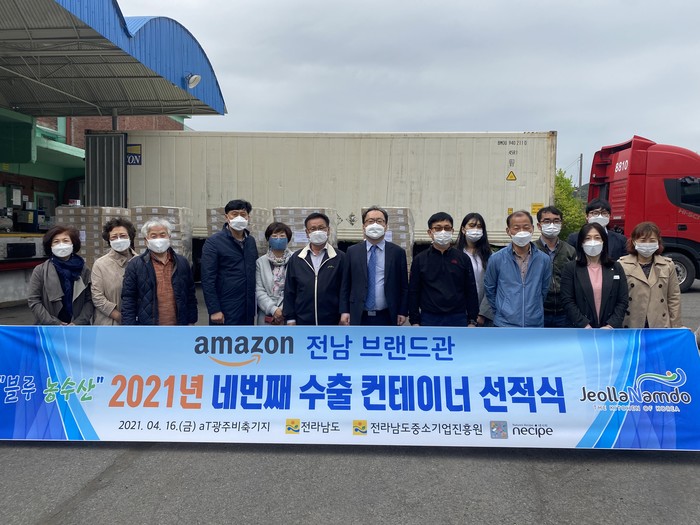전남도는 광주 aT 비축기지에서 미국 ‘아마존 전남 브랜드관’에 입점할 전남 농수산식품 수출 선적식을 했다고 19일 밝혔다. 수출물량은 14개 기업 29개 제품, 17만 5천 달러 상당이다.