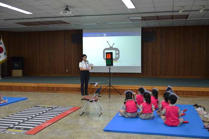 이날 교육에서는 횡단보도 모형을 활용한 안전한 횡단보도 보행법 ‘서다-보다-걷다’에 대해 배우고, 실습하는 시간을 가지는 체험형 교통안전교육을 실시했다.