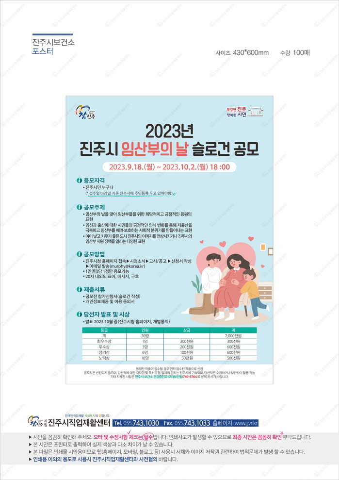 선정 결과는 10월 중 진주시 홈페이지를 통해 발표하고 당선된 슬로건은 각종 임신출산 지원사업 홍보나 시책에 활용할 예정이다
