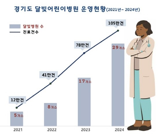 밤에도 낮과 동일하게 소아 환자를 진료하는 달빛어린이병원 31곳은 평일 23시, 주말 18시까지 외래 진료를 통해 응급실 과밀화와 이용부담을 줄여준다. 2021년 12만 건이었던 달빛어린이병원 야간.휴일 진료건수는 2024년 105만건으로 8.6배 증가했으며 운영기관 수 역시 5개에서 31개로 6.2배 늘었다.