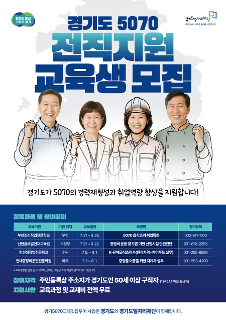 ▲경기도 5070 전직지원 프로그램 교육생 모집 포스터(사진=경기도일자리재단) |