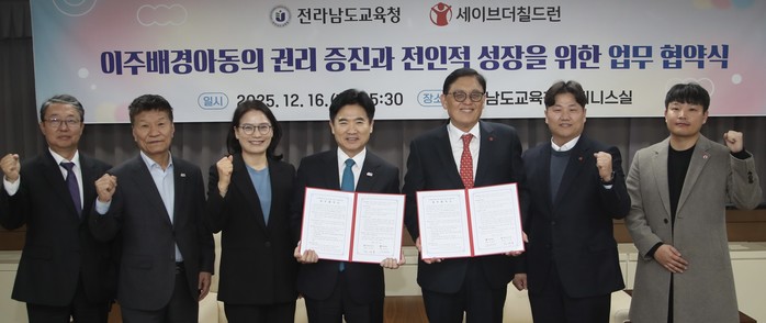 [전남=프레스뉴스] 강래성 기자= 전라남도교육청(교육감 김대중)은 16일 청사 비즈니스실에서 세이브더칠드런(총장 정태영)과 ‘이주배경아동의 권리 보장과 전인적 성장을 위한 업무협약’을 체결했다.