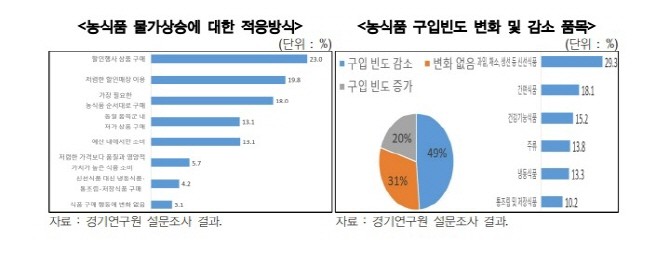 | ▲ 농식품 물가상승에 대한 적응방식, 농식품 구입빈도 변화 및 감소 품목 그래픽(사진=경기연구원) |