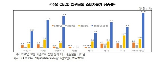 | ▲ 주요 OECD 회원국의 소비자물가 상승률 그래픽(사진=경기연구원) |