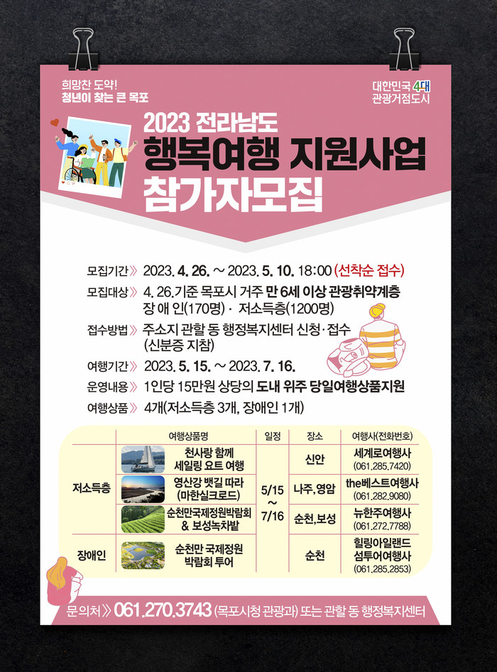 | ▲ 2023년 전라남도 행복여행 지원사업 참가자 모집 포스터(사진제공=목포시) |