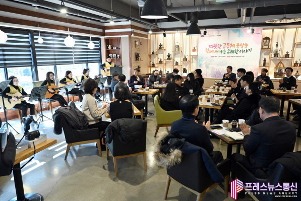 | ▲통기타 연주 '퉁기퉁기'팀이 지난 5일 중앙동 해밀시아 카페에서 열린 '희망을 나누는 첫인사, 동행' 행사에서 연주를 하고 있다.(사진=안산시) |