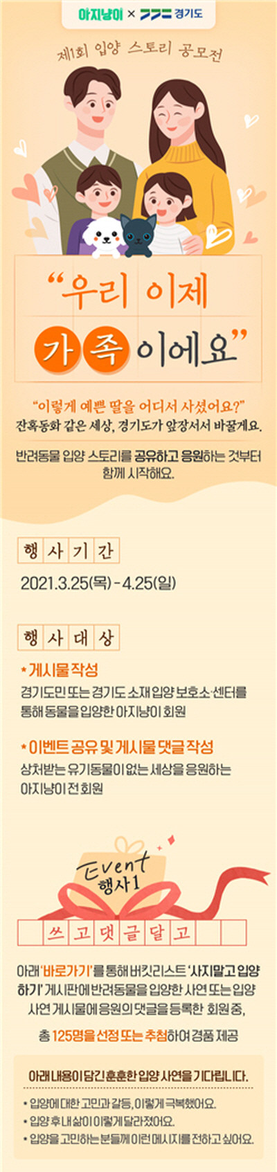 이번 공모전은 경기도가 민관협업 차원에서 지난해 9월 아지냥이 운영사인 삼성카드㈜와 맺은 ‘유기동물 입양 활성화와 올바른 반려동물 문화 확산을 위한 업무협약’의 일환이다.