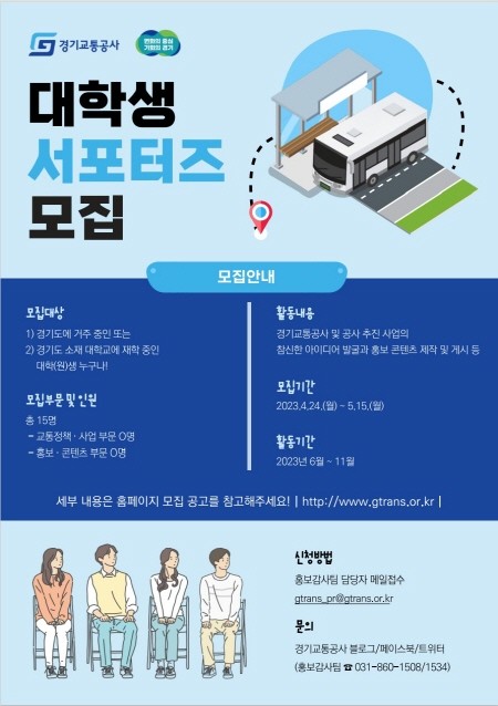 [프레스뉴스] 김대일 기자= 경기교통공사는 4월 24일부터 5월 15일까지 대학생 서포터즈를 모집한다.