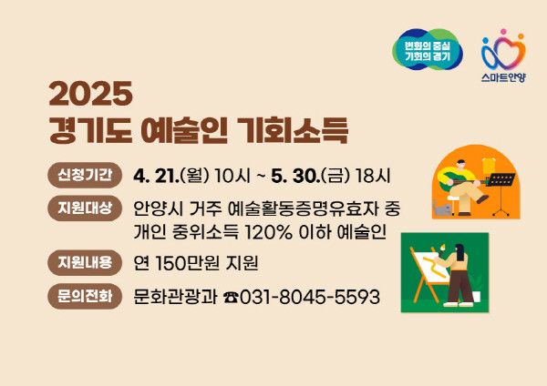 [프레스뉴스] 장현준 기자= 안양시가 ‘2025 경기도 예술인 기회소득’사업에 참여할 대상자를 이달 21일 오전 10시부터 5월 30일 오후 6시까지 모집한다고 18일 밝혔다.