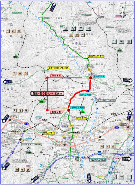 지방도 387호선 ‘화도~운수’ 구간은 총사업비 1천687억 원을 투입해 남양주시 화도읍 가곡리(너구내고개)에서 수동면 운수리(운수교차로)까지 4.52㎞를 기존 2차로에서 4차로로 확장하는 사업이다. 준공은 2029년 하반기다.