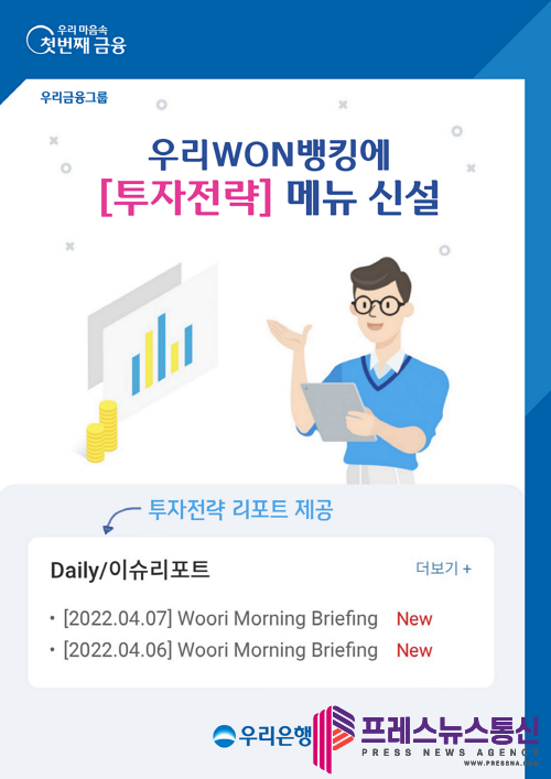 [프레스뉴스] 김대일 기자= 우리금융지주의 자회사 우리은행(은행장 이원덕)은 우리WON뱅킹에‘투자전략’메뉴를 신설하고, 금융시장정보와 투자전략 리포트를 고객에게 제공하기로 했다고 8일 밝혔다.