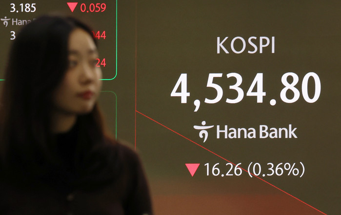| ▲코스피가 전 거래일(4551.06)보다 19.60포인트(0.43%) 하락한 4531.46에 개장한 8일 오전 서울 중구 하나은행 딜링룸 전광판에 지수가 표시됐다./사진=뉴스1 |
