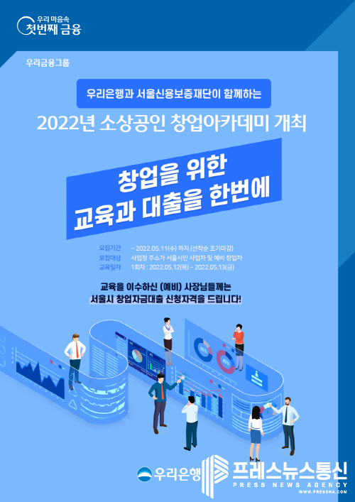 [프레스뉴스] 김대일 기자= 우리금융지주의 자회사 우리은행(은행장 이원덕)은 5월 12~13일 이틀 동안 서울시 중구에 소재한 본점에서 예비 창업자의 성공적인 창업을 위한‘우리은행과 서울신용보증재단이 함께하는 소상공인 창업아카데미’를 개최한다고 5일 밝혔다.