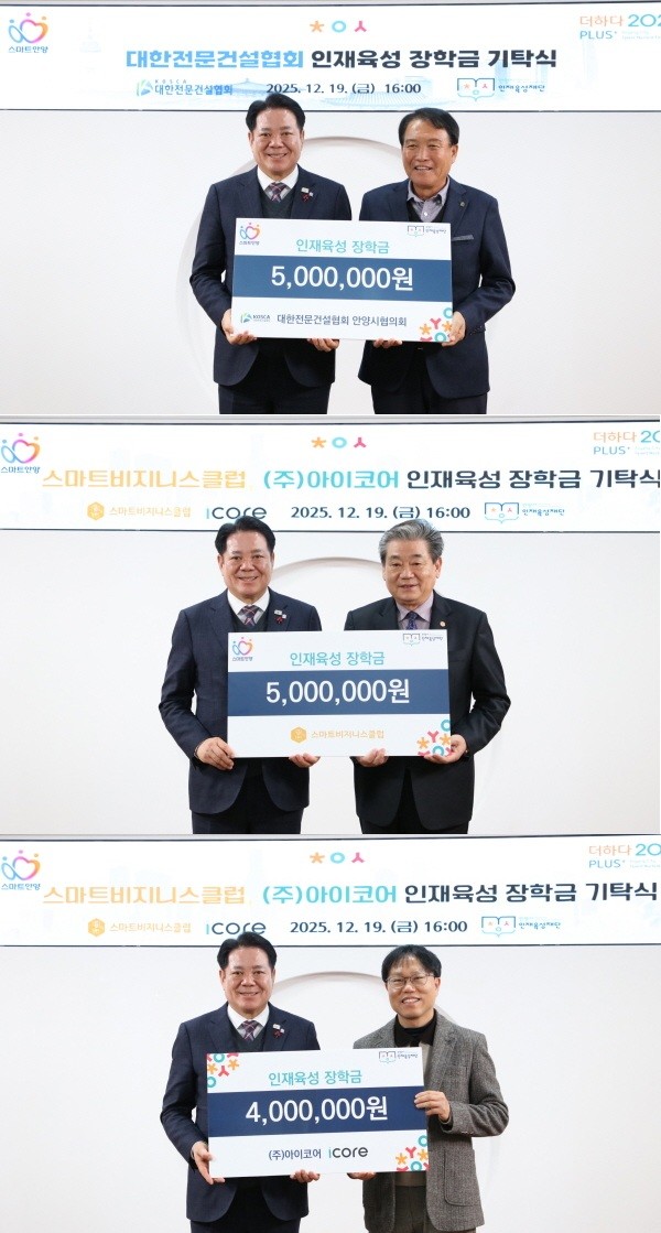 | ▲지난 19일 열린 인재육성 장학금 기탁식(사진 위부터 대한전문건설협회, 스마트비지니스클럽, ㈜아이코어)사진=안양시 |