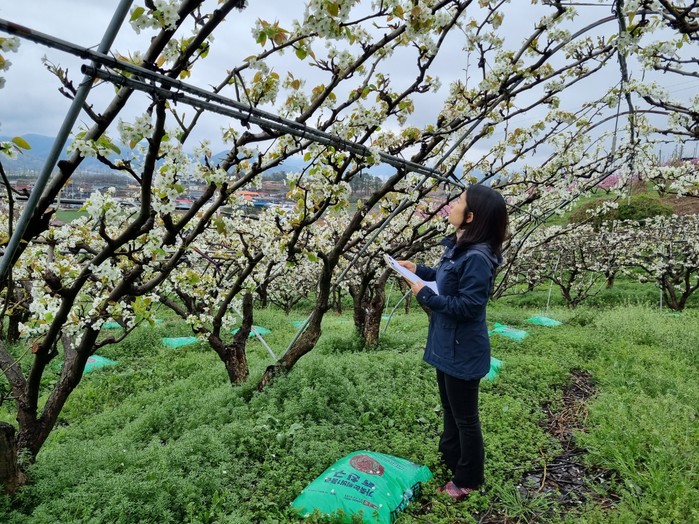 | ▲화순군 농촌지도사가 배 과원을 방문해 배 과수 생육을 예찰하고 있다.(사진제공=화순군) |
