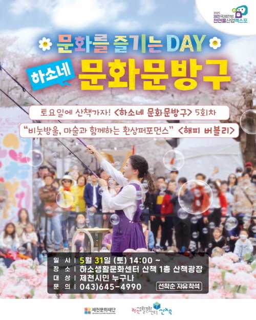 문화재단 관계자는 “아이부터 어른까지 함께 웃고 감동할 수 있는 ‘해피 버블리’ 공연은, 일상 속 문화예술의 기쁨을 새롭게 발견할 수 있는 시간이 될 것”이라며 “주말 오후, 하소생활문화센터 산책에서 펼쳐지는 환상적인 마법 공연에 많은 시민들의 관심과 참여를 바란다”고 말했다.