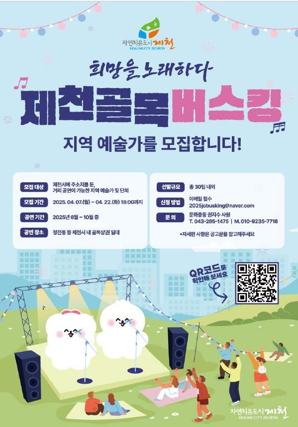 한편 ‘2025 희망을 노래하다, 제천골목버스킹’ 지역예술가 모집에 대한 자세한 내용은 제천시 누리집 공지사항을 참고하면 된다.