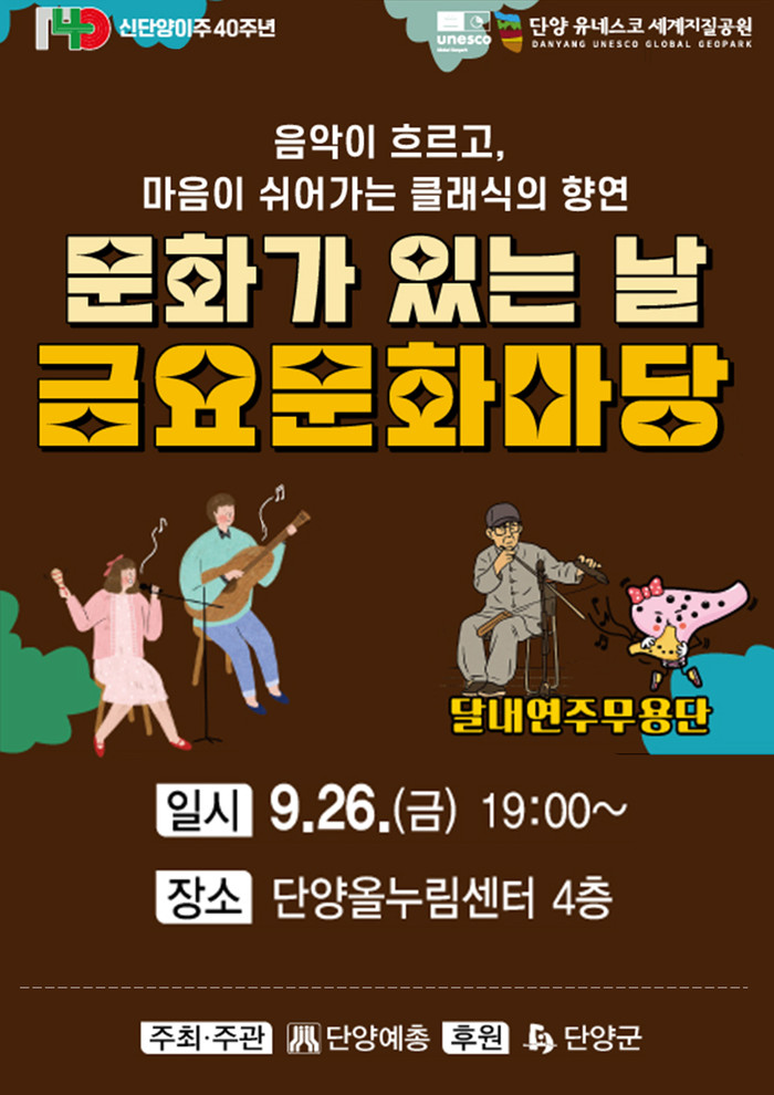 군 관계자는 “문화가 있는 주간 금요문화마당은 일상 속에서 문화를 접할 수 있는 소중한 기회가 될 것”이라며 “앞으로도 다양한 문화 프로그램을 통해 군민과 관광객이 함께 즐길 수 있는 문화공간을 확대해 나가겠다”고 말했다.