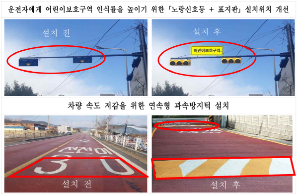 그간 도내 31개 시군에서는 어린이보호구역에 통합표지판을 비롯한 교통안전시설을 개선했고 무인과속단속카메라 1,059대, 신호등 2,790개소, 어린이보호구역임을 알리는 통합표지 9,300개소 등을 설치했다.
