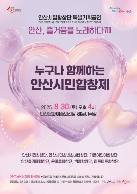 ‘안산, 즐거움을 노래하다’는 시민과 함께 만들어가는 안산시립합창단의 대표적브랜드 공연으로 올해 8회째를 맞았다. 이번 공연에서는 안산시립합창단의 교육사업 ‘안산뮤직아카데미’에서 양성된 안산시민성인합창단과 안산시민소년소녀합창단이 협업하고, 지휘마스터클래스 수료자가 객원지휘에 나선다.
