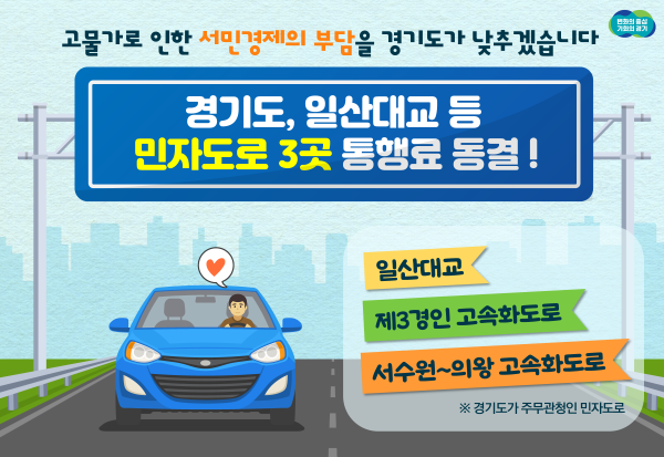 경기도는 지난해에 이어 올해 2년 연속 도에서 관리하는 ‘일산대교’, ‘제3경인 고속화도로’, ‘서수원~의왕 고속화도로’ 등 민자도로 3곳의 통행료를 동결한다고 31일 밝혔다. 지난 2월 버스요금 이후 두 번째 공공물가 인상 동결 조치다.