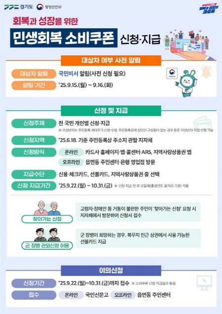 [프레스뉴스] 장현준 기자= 경기도가 9월 22일부터 10월 31일까지 민생회복 소비쿠폰 2차 지급 기간이라며, 대상자 여부와 오프라인 신청방법 확인을 당부했다.