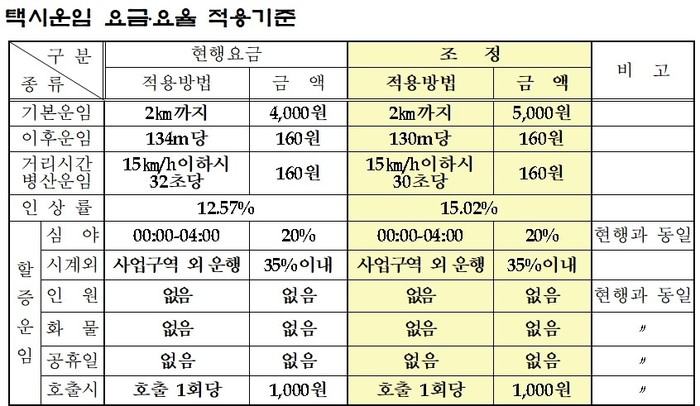 인상 요금 체계에 따르면 중형 택시 기준 기본요금(2km)은 5,000원으로 조정되며 거리요금은 기존 134m당 160원에서 130m당 160원으로, 시간요금은(15km/h이하 주행 시) 32초당 160원에서 30초당 160원으로 조정된다.