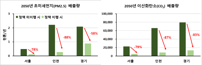 서울, 인천, 경기의 초미세먼지 배출량은 각각 78%, 88%, 58% 감소, 이산화탄소 배출량은 79%, 87%, 83% 감소할 것으로 나타났다.