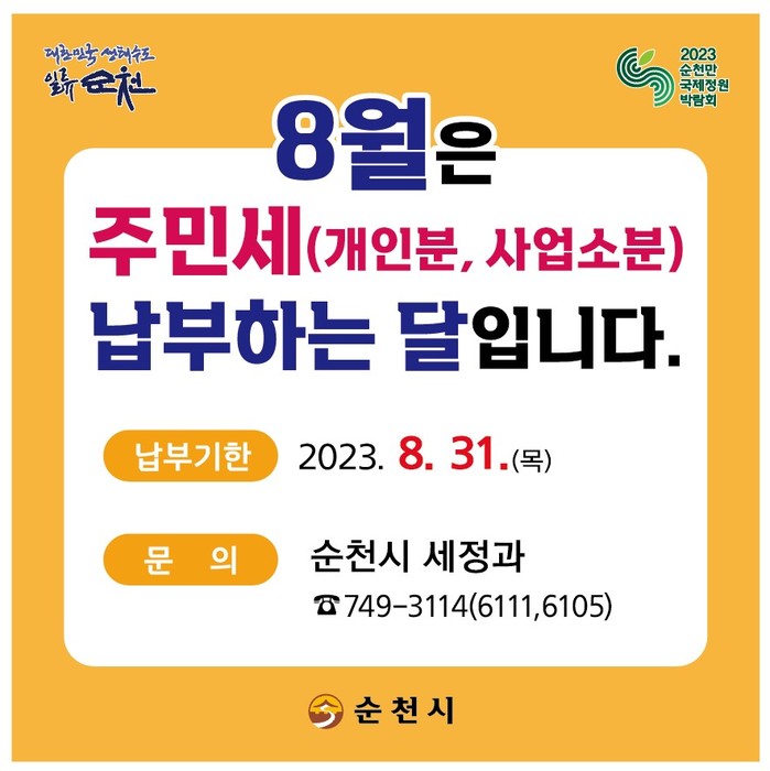 순천시 관계자는 “주민세는 주민 삶과 밀접한 현장 중심의 주민자치 환원사업비로 사용하는 소중한 재원”이라며 “납기 내 납부를 당부드린다”라고 말했다.