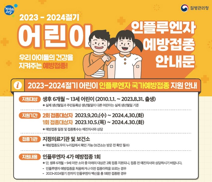 2023-2024절기 인플루엔자 예방접종은 2회 접종을 받아야 하는 어린이 접종을 9월 20일부터 시작하며, 한꺼번에 사람이 몰리는 것을 예방하고 안전하게 접종하기 위해 연령별로 접종 시작일을 구분해 접종한다.