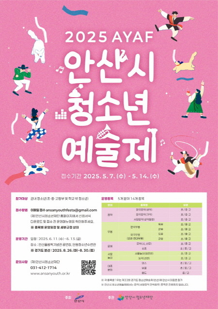 [프레스뉴스] 장현준 기자= 안산시(시장 이민근)는 오는 7일부터 14일까지 ‘2025년 안산시 청소년예술제’에 참가할 청소년을 모집한다고 2일 밝혔다.