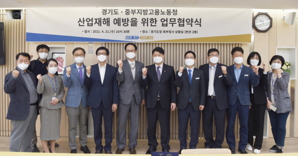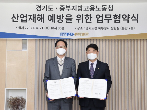 이한규 경기도 행정2부지사와 이헌수 중부지방고용노동청장은 21일 오전 경기도청 북부청사 상황실에서 이 같은 내용을 골자로 한 ‘경기도 산업재해 예방을 위한 업무협약’을 체결했다.