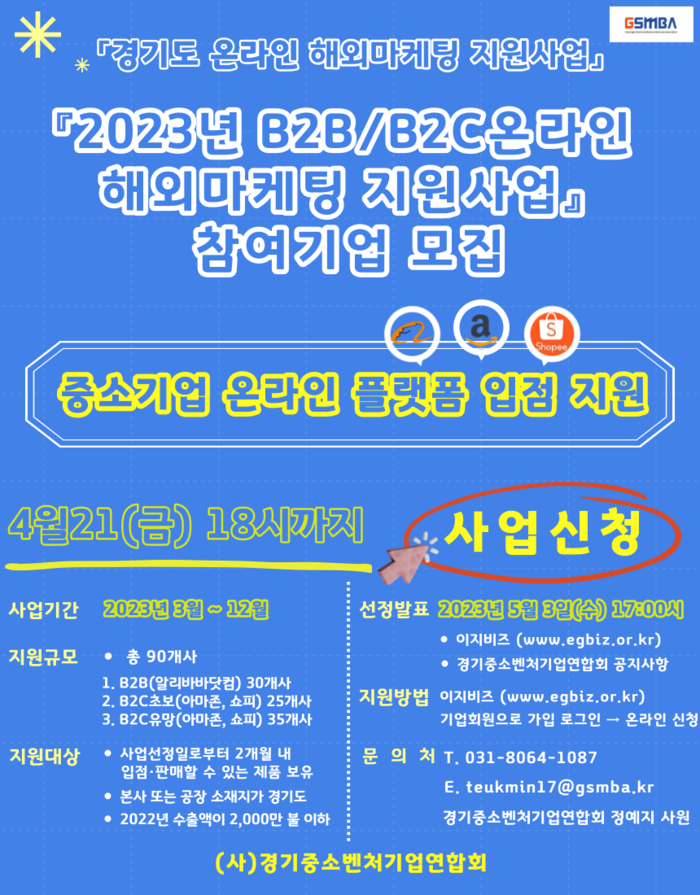 ‘2023년 B2B/B2C 온라인 해외마케팅 지원사업’ 신청은 오는 21일 오후 6시까지 ‘이지비즈’를 통해 가능하다. 자세한 공고내용은 이지비즈 누리집이나 (사)경기중소벤처기업연합회 기업지원사업팀으로 문의하면 된다.
