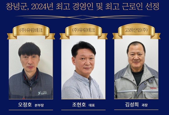 올해 최고 경영인에는 ㈜유림테크 창녕공장의 조현호 대표, 최고 근로인에는 ㈜유림테크 창녕공장의 오정호 본부장과 고려산업(주) 창녕공장의 김성희 과장이 선정됐다.