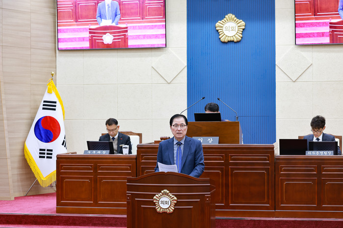 | ▲신우철 완도군수가 제325회 완도군의회 정례회에서 시정연설을 통해 내년도 군정 운영 방향을 밝혔다.(사진제공=완도군) |