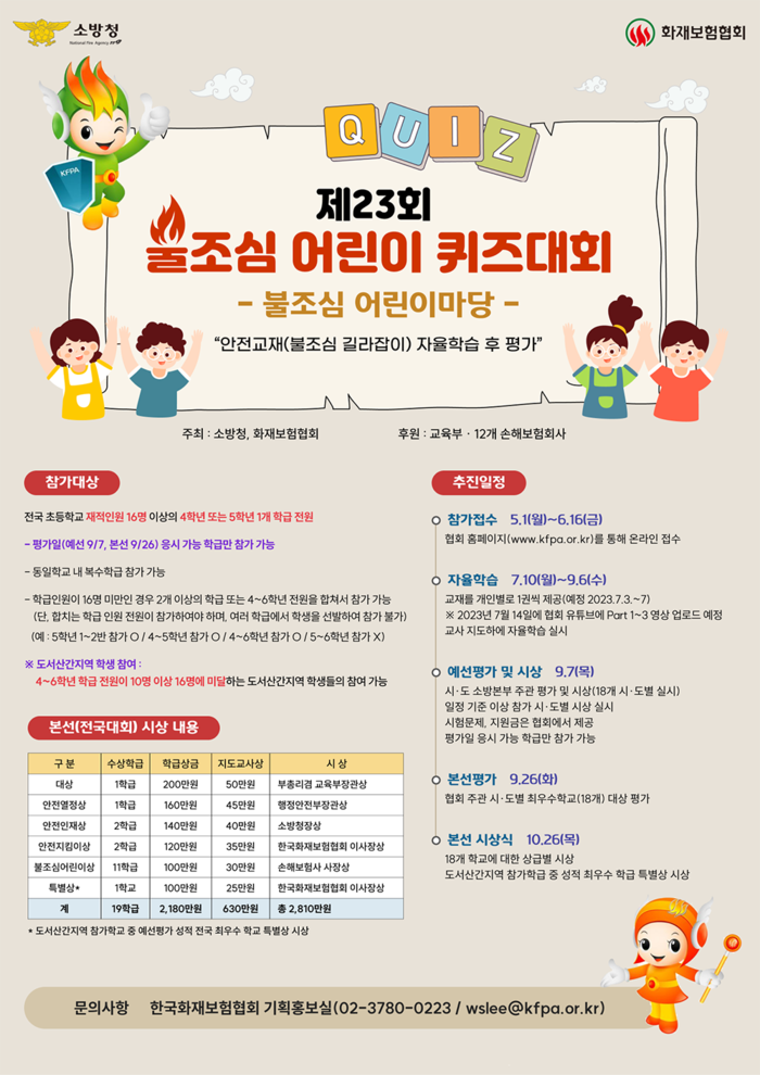 참가 학급 전원에게는 ‘불조심 길라잡이’ 안전 교재가 제공된다. 내달부터 2개월간 학습 기간을 거쳐 오는 9월 7일 참가 학급 해당 교실에서 평가받게 된다.
